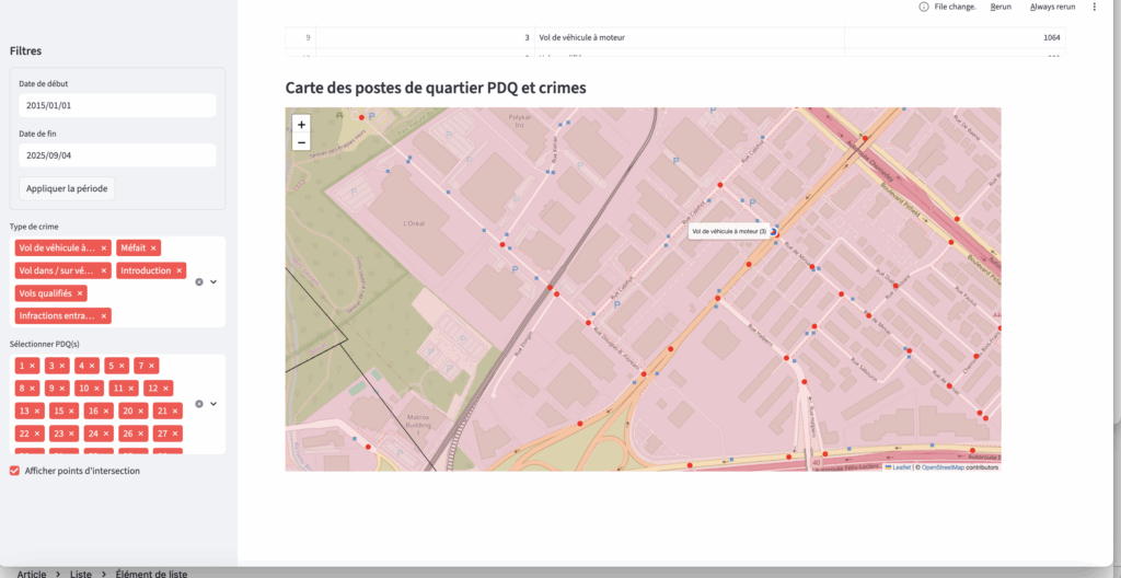 - explorer une carte interactive combinant les polygones des PDQ et les points représentant les crimes