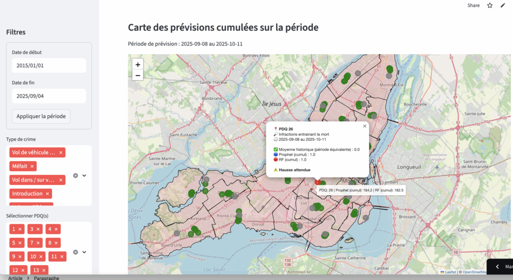 Pour chaque combinaison poste de quartier (PDQ) + type de crime, j’ai entraîné les modèles sur les données historiques.