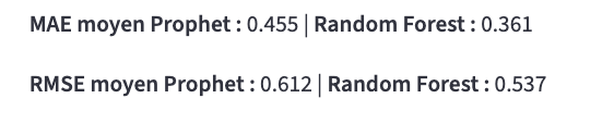 Les deux modèles sont complémentaires : Prophet excelle pour les cycles, Random Forest pour la flexibilité.